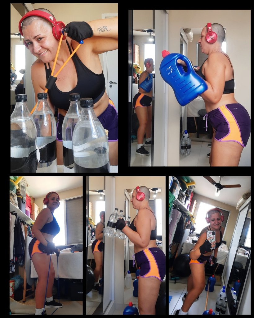 E sigo aqui, no quartinho da bagunça me exercitando e dançando, levantando meus galões com água rs e alguns aparelhos.