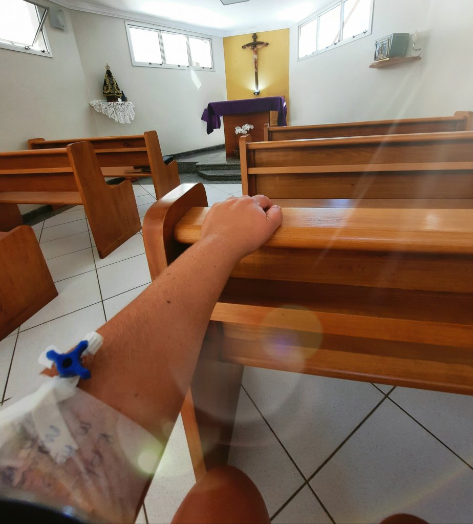 Em uma das minhas orações na capela do hospital, olhei pro altar e pensei. – Agora, no centro cirurgico, tem pessoas lutando pela vida e médicos fazendo de tudo para salvar a vida de uma mãe, pai, filho, filha, avó, avô, irmão, irmã, amigo…. Que Deus esteja presente por lá!