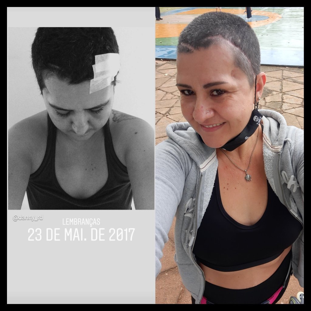 Nesta foto de 2017, eu sentia muita dor Tomava antibióticos fortes. Eu estava muito triste pelas dores e pela ferida que não fechava na cabeça, por causa da segunda clipagem, tive que tomar muita medicação, toda semana tinha que voltar ao hospital…. Era a placa que estava dando rejeição, que hoje só ficou nas lembranças… foi retirada!