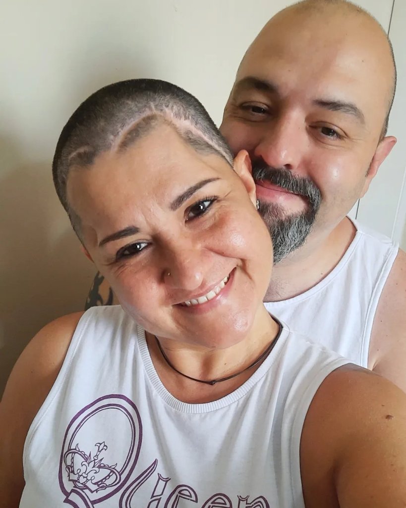 Mas sei que sou uma mulher de sorte, por ter ao meu lado um marido que me apoia e que raspa os cabelos para ficar junto! Ele me faz acreditar no melhor!