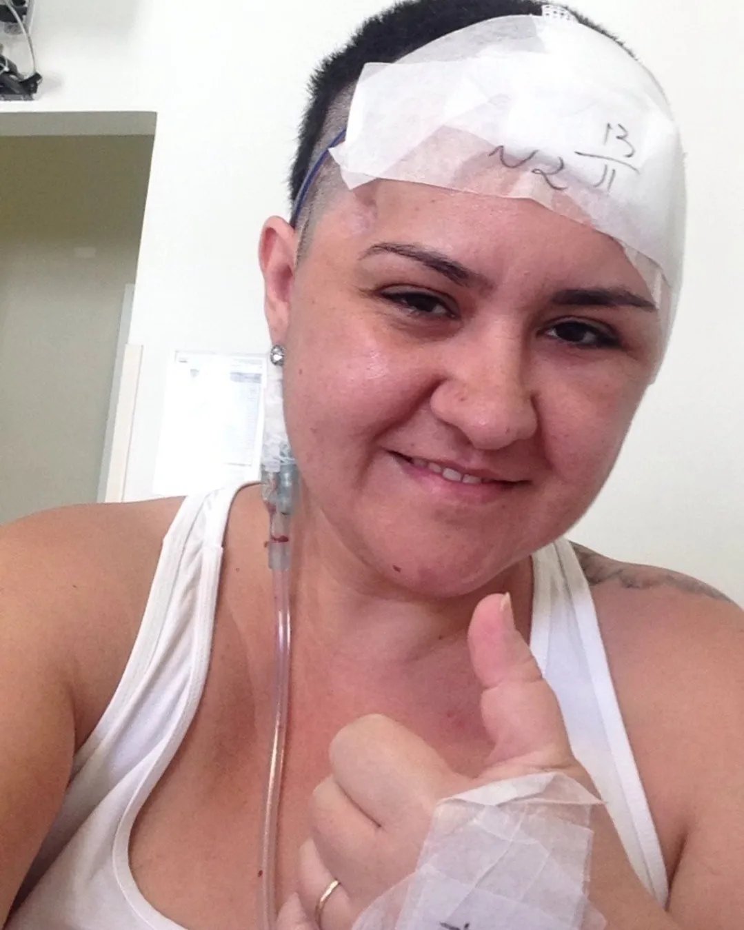 Da primeira cirurgia, meu cabelo foi raspado pela metade! Logo vieram as outras! E na segunda clipagem, já raspei o cabelo todo! Depois veio a rejeição da prótese craniana, e depois também a rejeição dos parafusos!